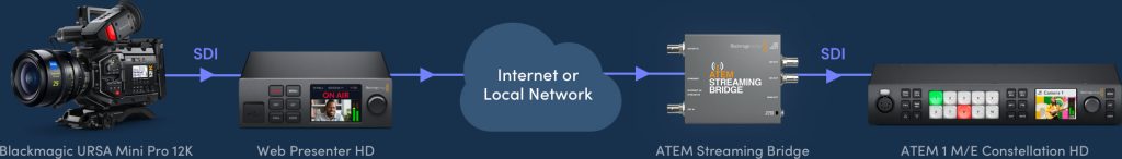 Meskipun Blackmagic Web Presenter dapat mengirim video ke berbagai layanan streaming, Blackmagic Web Presenter juga dapat digunakan sebagai tautan video SDI siaran pribadi antar studio! ATEM Streaming Bridge adalah konverter video yang memungkinkan Anda menerima streaming H.264 dari Blackmagic Web Presenter dan kemudian mengonversinya kembali ke video SDI. Artinya, Anda dapat mengirim video antar lokasi terpencil melalui jaringan Ethernet lokal, atau melalui internet secara global! Itu semua dimungkinkan berkat codec perangkat keras H.264 bawaan yang menerjemahkan aliran Web Presenter. Bayangkan menyiapkan beberapa studio televisi dan menggunakan ATEM Streaming Bridge dan Web Presenter untuk link video antarsitus.