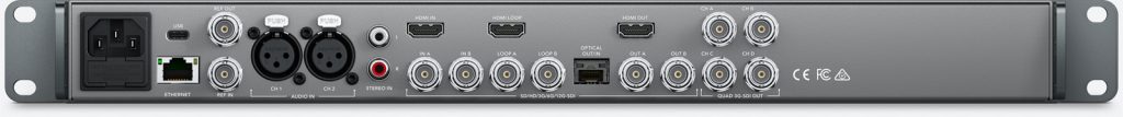 Teranex AV dilengkapi input, loop through, dan output 12G‑SDI dan HDMI 2.0a serta koneksi BNC untuk referensi. Anda juga mendapatkan 2 saluran konektor HiFi dan XLR konsumen untuk 4 saluran AES/EBU atau 2 saluran audio analog seimbang. Hal ini menjadikan Teranex AV sempurna untuk presenter yang menggunakan mikrofon lavalier atau menggunakan audio komputer laptop karena audio tersebut dapat disematkan dengan video pada output apa pun! Bahkan terdapat sangkar serat optik untuk menambahkan modul opsional sehingga Anda dapat mengirim video dan audio dalam jarak jauh! Jika Anda hanya memerlukan SDI, Anda dapat menggunakan Teranex Express, yang memiliki semua koneksi 12G‑SDI.